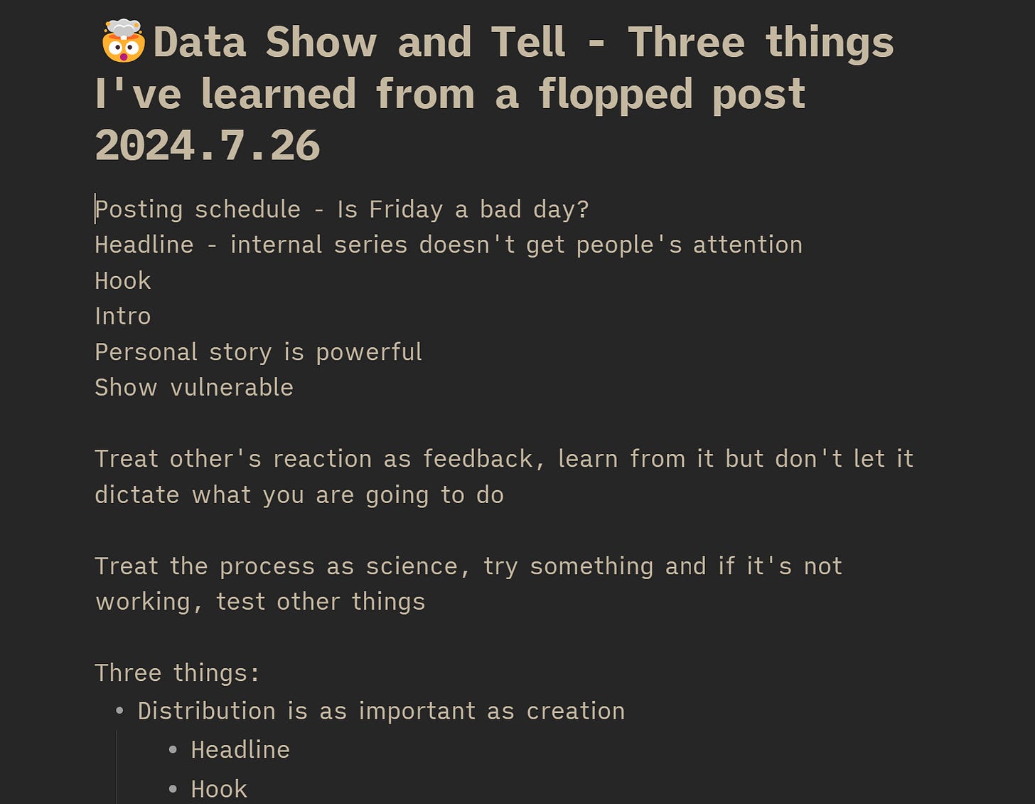If I have a presentation next week, a week or two before that, I’ll create a document called an 'idea dump' and start writing down any ideas that might be related to the presentation👇